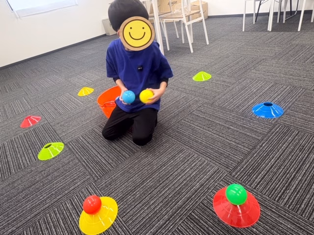 1つ目は、カラーボールを同じ色の紙コップに入れる遊びです。