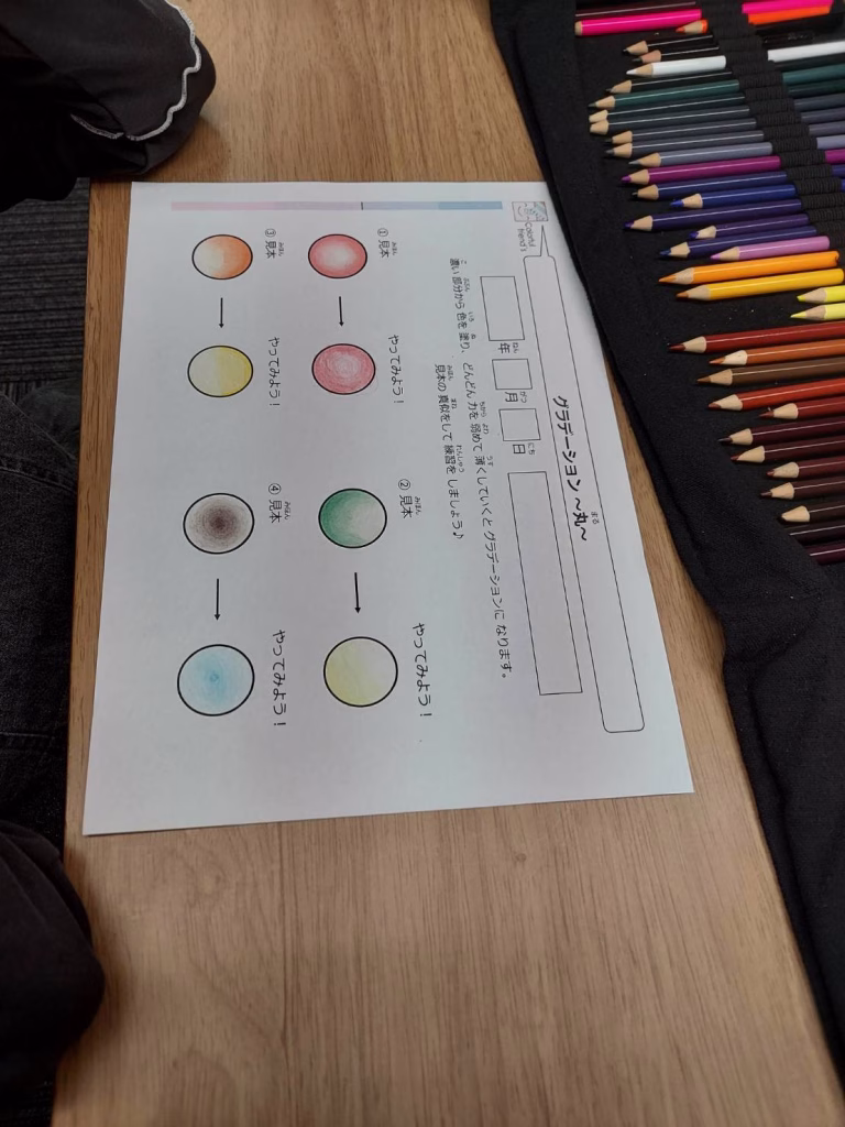 先日は手先の力加減が求められる、グラデーションに色を塗るプログラムを行いました。まずは職員の説明を聞きます!みんなしっかり集中して聞くことができていましたよ👍