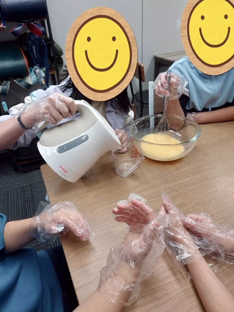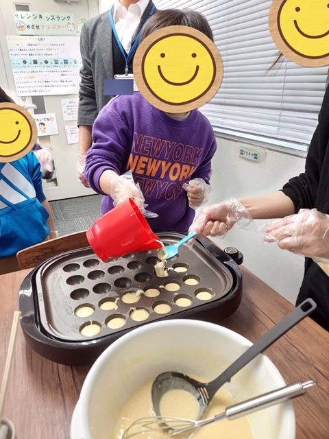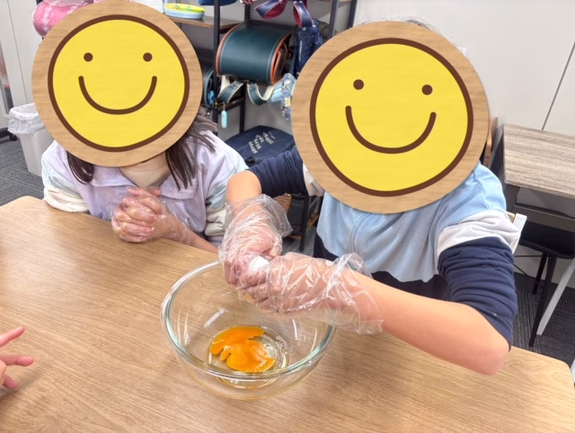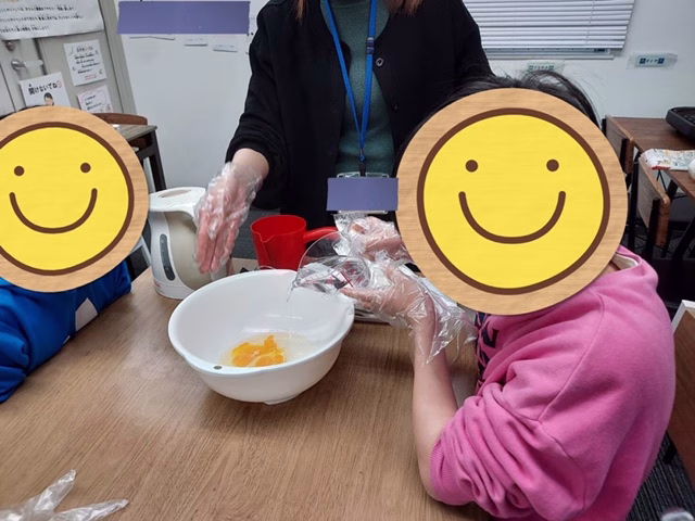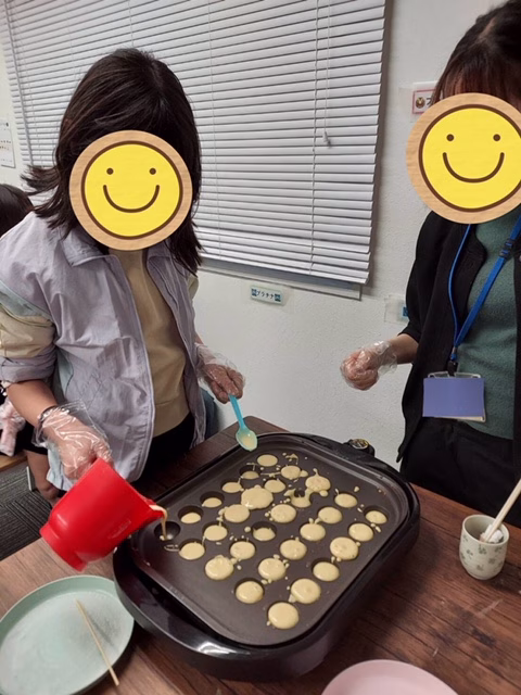 ホットケーキミックスを入れるお友達や水を量って入れるお友達、卵を割るお友達などに役割分担をして取り組みましたよ。