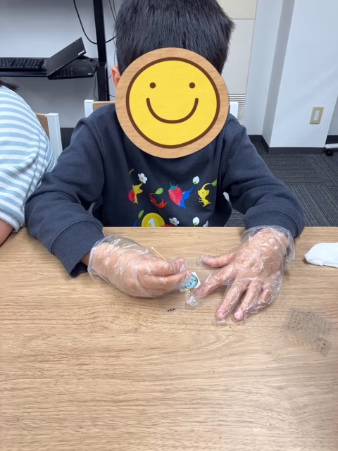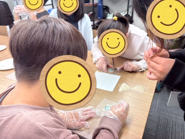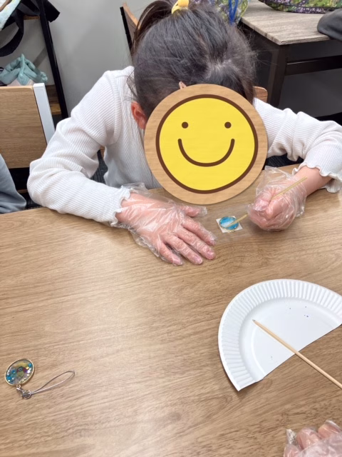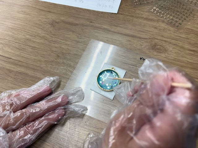 伸ばしたレジンが固まったら、ラメやシールなどを使って飾り付けます✨集中力のいる作業でしたが、みんな竹串やピンセットを使って慎重に取り組んでいましたよ。