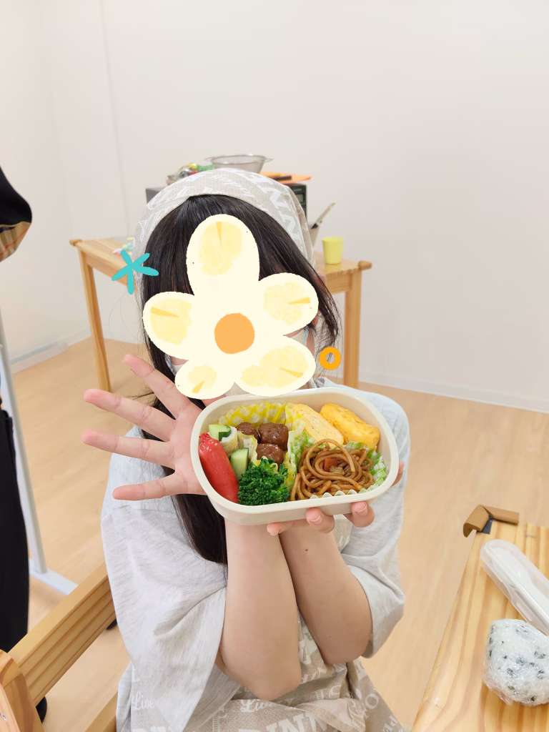 炊き立てのご飯でおにぎりを作り、完成したおかずたちを自分のお弁当箱に詰めていきました😊
